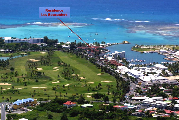 La résidence Les Boucaniers est située avenue de l'Europe à proximité de la plage du lagon, de la marina, du golf et des commerces, juste avant l'hôtel de la Cocoteraie.
